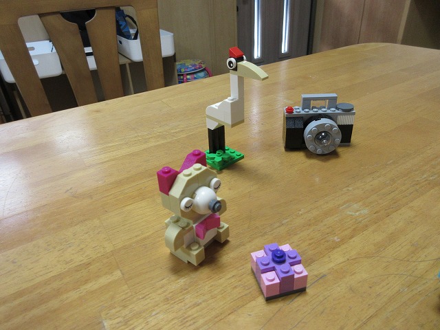 写真は、子どもたちが夏休み中に作ったレゴブロックや折り紙の作品です。