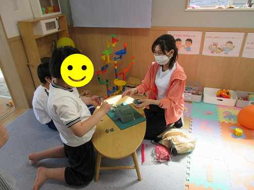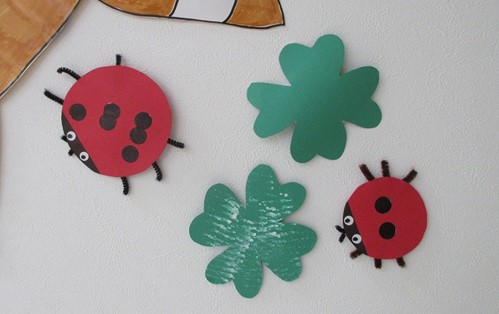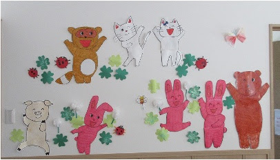 力加減や指先の訓練も兼ねて、テントウムシの模様をシールで貼ったり、絵の具スタンプをしてクローバーを作ったりして遊びました。ノンタンたちも嬉しそうだね。