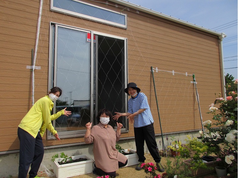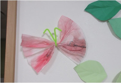 キッチンペーパーに好きな色のペンで模様を書き、霧吹きの水を吹きかけました。すると…!インクがにじんで、きれいな模様になりました。乾いてからモールで結ぶと、かわいいチョウができました。壁に飾ったチョウを見て、みんな喜んでいました。